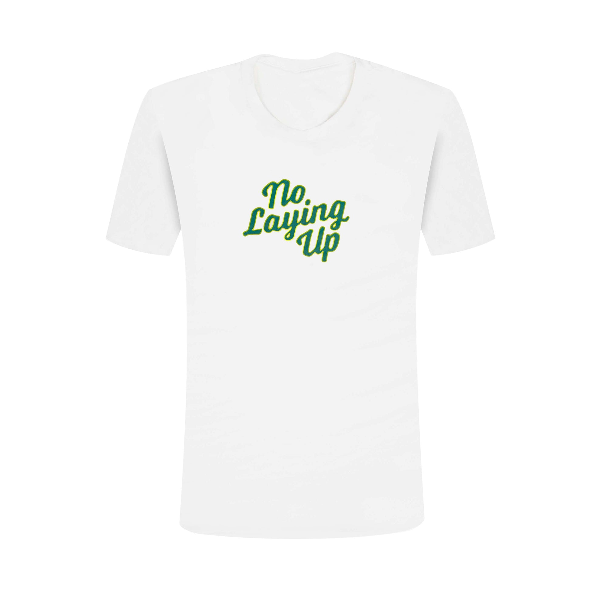 A new No Laying Up wordmark shirt debuts this spring.  The two-toned Green and Yellow NLU Retro Rectangle font takes center stage at the center front of this super soft white Next Level crew neck T-shirt.  In a colorway fit for the First Major of the year, this shirt should find a place in your closet's rotation.