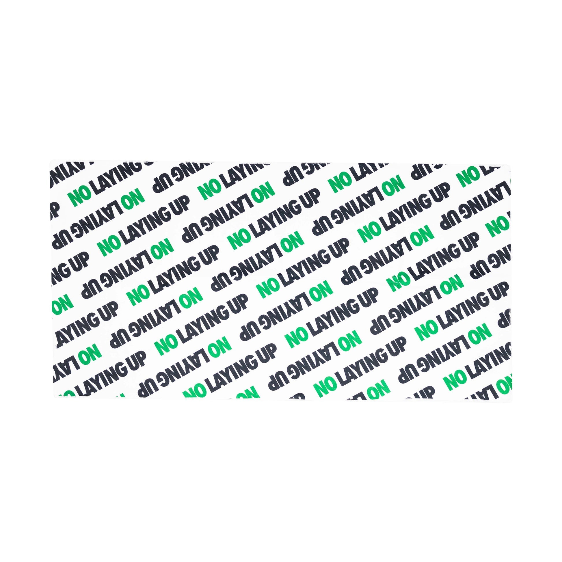 The No Laying Up Script Towel with green and black NO LAYING UP block lettering throughout.